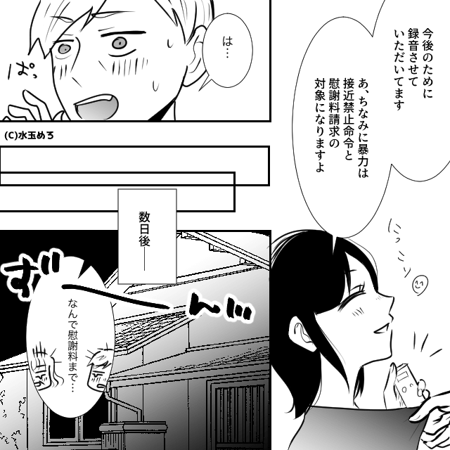 家がめちゃくちゃになったことで夫と義母は主人公を責めてきますが、主人公は気にせず今まで支払った生活費の精算を求めました。 すると夫は激怒して主人公に暴力をふるおうとしますが、主人公が録音していることに気づいて慌ててやめます。