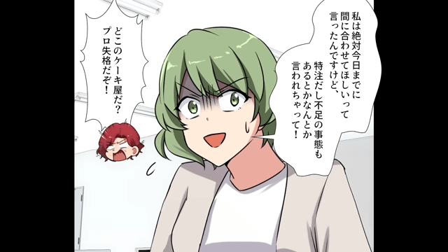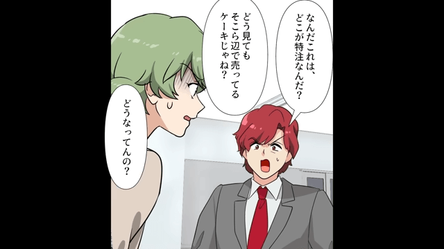 今回は『当日に予約キャンセルした客の目的』を紹介します。 同級生が用意したケーキを見た社員は「こ、これが特注?」と戸惑います。 それに対し同級生は「見た目より味でしょ!?」と言い張るのですが…。
