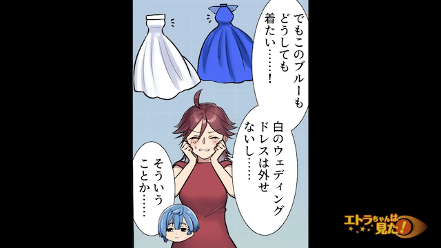 今回は『結婚式に現れた義母の格好に絶句した話』を紹介します。 結婚式に向けて、ドレス選びをしていた主人公。 気に入ったドレスを婚約者に見せると、婚約者は「似合ってる!それにしようか」と賛成してくれて…。