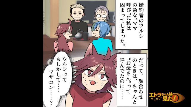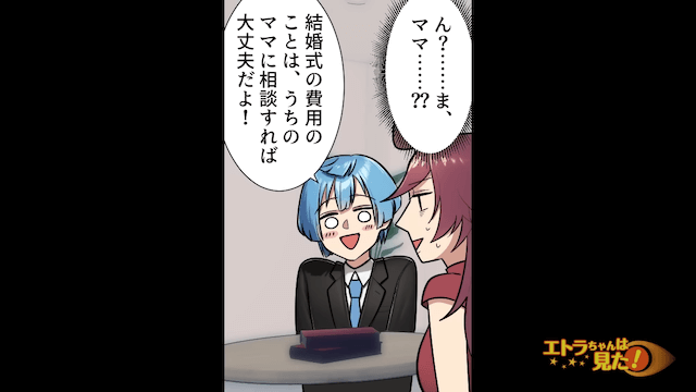 主人公が気に入ったドレスが予算オーバーであることを相談すると、婚約者は「いいよ、大丈夫!」と快諾してくれたのですが…。 次の瞬間、婚約者が「ママに相談してみる!」と言い始め、主人公は婚約者がマザコンなのではないかと疑い、固まってしまったのでした。
