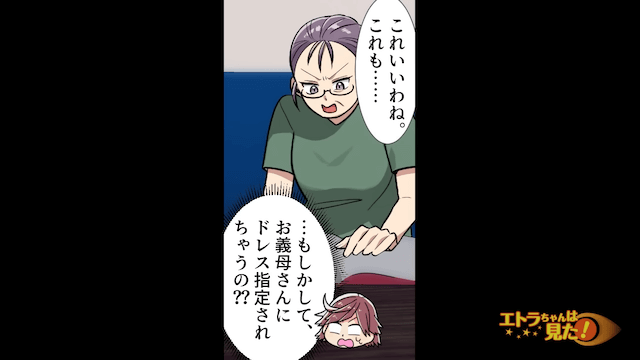 婚約者の態度に違和感を抱いたものの、気に入ったドレスを諦めきれなかった主人公。 その結果、式の打ち合わせに義母が同席することになりました。