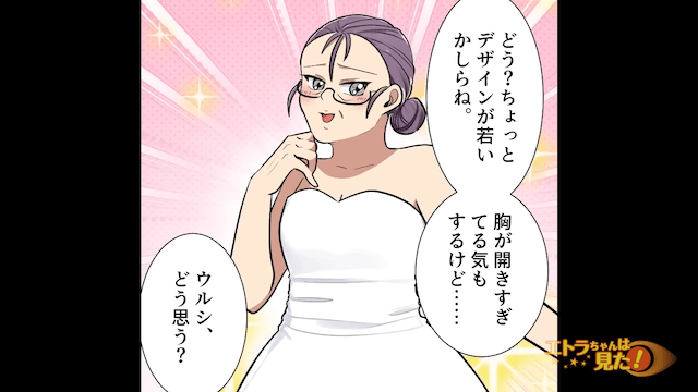 今回は『結婚式に現れた義母の格好に絶句した話』を紹介します。 打ち合わせに同席した義母は、なぜかドレスを選び始めました。 そして「私、ウエディングドレスを着るの夢だったの!」と言い、ドレスを試着しようとして…。
