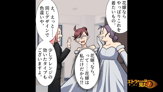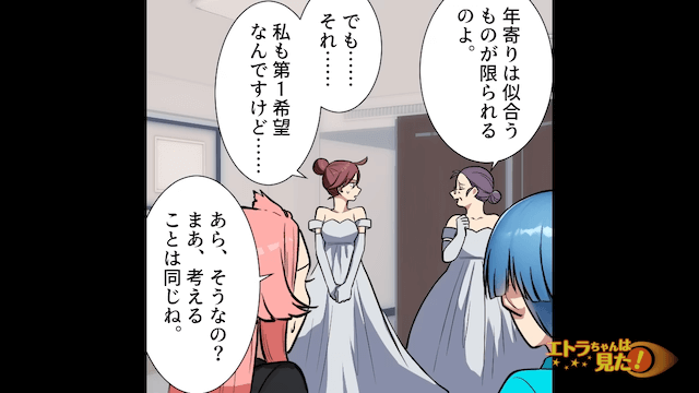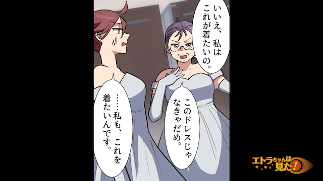 今回は『結婚式に現れた義母の格好に絶句した話』を紹介します。 ドレス選びの最終日、主人公の第1候補のドレスが義母と被ってしまいます。 義母は「譲ってくださるわよね」と主人公に譲ってもらう気満々で…。