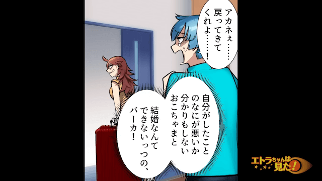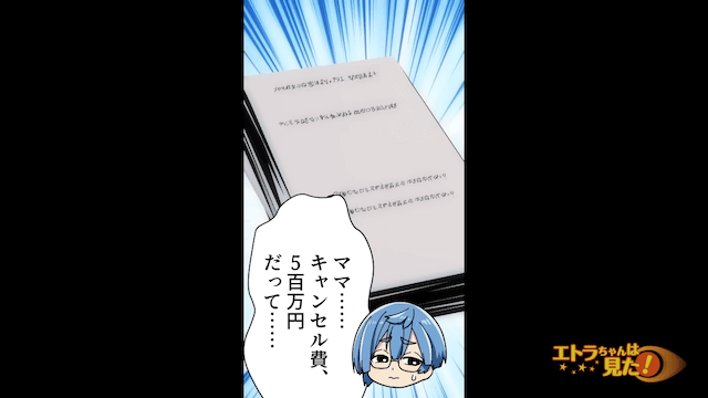 帰宅後、必死にすがってきた婚約者に婚約破棄を突きつけた主人公。 そして婚約者と義母には、結婚式のキャンセル費用として500万円が請求されて…。