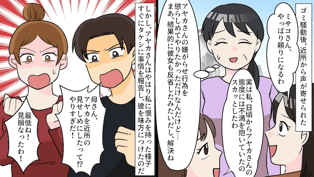 腹を立てた主人公は防犯カメラを設置し、嫁の悪事を近所の人にも伝えました。
