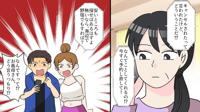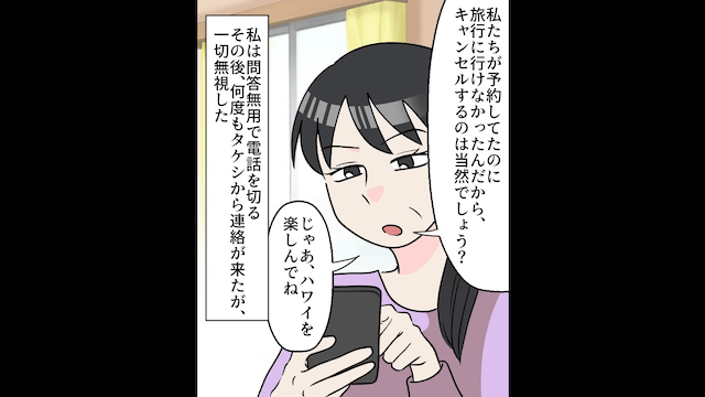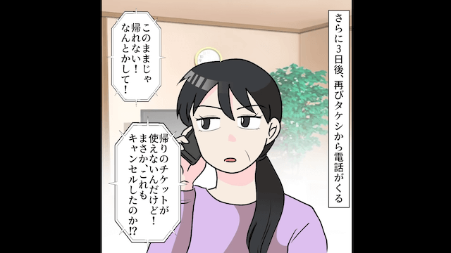 息子夫婦も嫁の両親も悪びれる様子はなく、ATM扱いされた主人公は激怒します。 そして主人公が帰りの飛行機とホテルの予約をキャンセルすると、息子夫婦は慌て出したのでした。