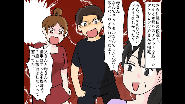 今回は『私たちが計画したハワイ旅行へ行った息子夫婦の末路』を紹介します。 息子夫婦に旅行を乗っ取られたため、帰りの飛行機の予約をキャンセルした主人公。 すると3日後、そのことに気づいた息子が慌てて連絡をしてきて…。
