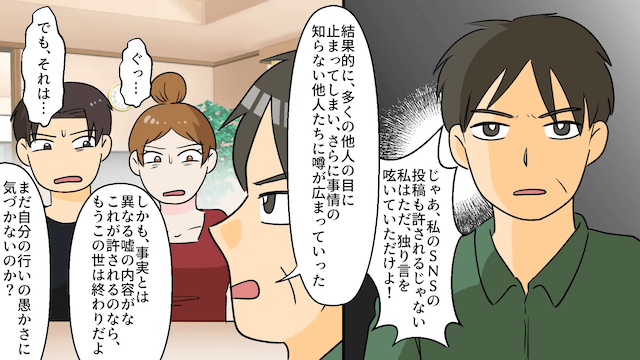 息子夫婦が懲りずに主人公を責めるため、夫は主人公を庇って息子夫婦を責めました。 しかし息子夫婦は「俺たちのせいじゃない」と一切反省せず…。