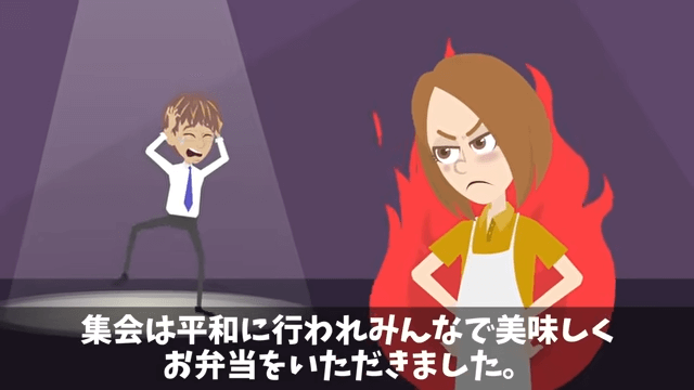 主人公が激怒すると、支店長は怯えながら「申し訳ございませんでしたあ!」と謝りました。 そしてその後、集会は平和に行われ、みんなで弁当をおいしく食べたのです。