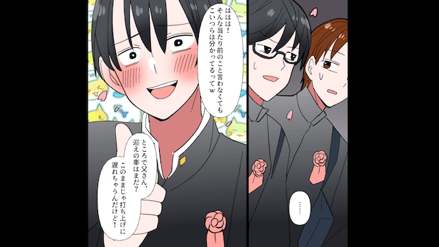 今回は『夫「家族失格だぞ!?」妻「私に家族は居ませんが?」家族に嫌われ続けた妻の逆襲の話』を紹介します。 卒業式が終わり、友人たちに偉そうな態度をとる息子。 友人たちは明らかに引いていますが、息子本人はそれに気づいておらず…。