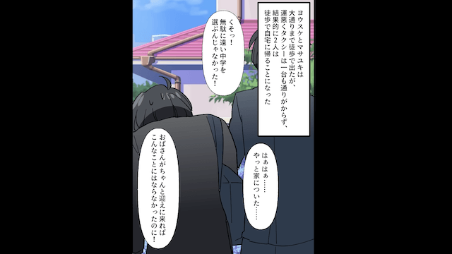 友人たちに本音を言われ、縁を切られてしまった息子。 しかし夫が息子を励まし、2人は徒歩で帰宅しました。