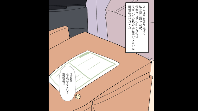 そして2人が怒り狂いながら家に入ると、リビングの机に離婚届が置かれていて…。