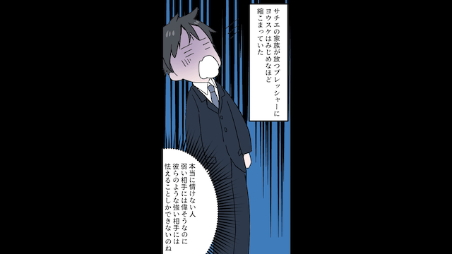 ママ友の家族の迫力に気圧された夫は、みじめなほど縮こまったのでした。