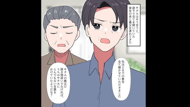 夫の嘘を見抜いたママ友が主人公への謝罪を要求すると、夫は逆ギレをしてママ友のことを侮辱しました。 そして夫が「結局偉いのは外で働いてる男なんだよ!」と威張ったため、ママ友は自分の夫と義父を呼び…。