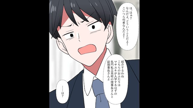 夫は主人公を悪者に仕立て上げようとしますが、ママ友の家族に反論され、ママ友の家族のことも見下します。 しかしママ友の義父と夫が、息子が入学する高校の理事長と副理事長だと知り…。
