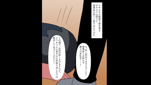 息子はママ友の義父に入学取り消しを告げられ、夫は必死に謝罪するのでした。