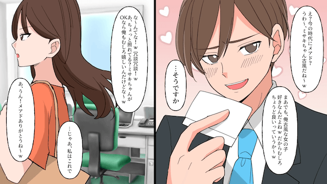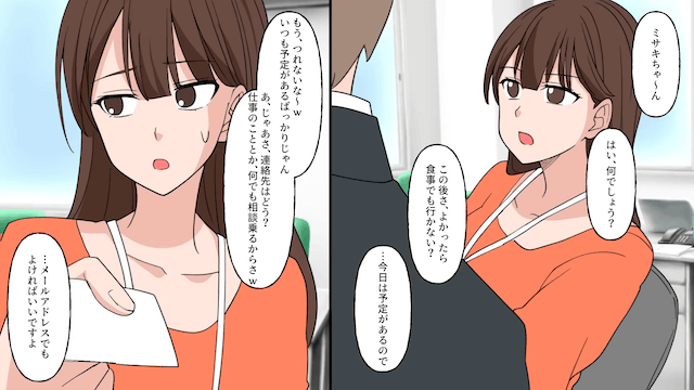 主人公が高校時代からの友人に離婚を報告すると、なんと元夫が話していた新入社員が友人の娘であることが判明。 その後、会社で友人の娘に連絡先を聞いた元夫は、メールアドレスを入手して喜んだのですが…。