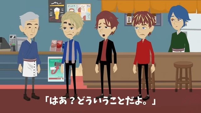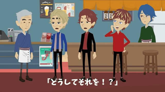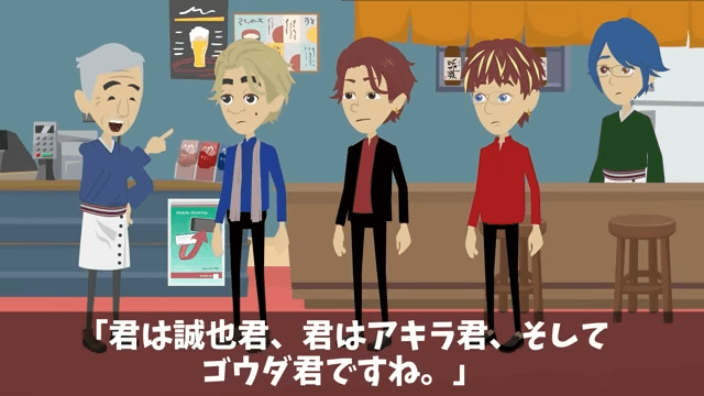 同級生たちを見た店主は「こんな風な大人になるとは…。情けない」とため息をつきます。 それを聞いた同級生が「はあ?どういうことだよ」と言うと、店主は同級生1人1人の名前を呼び始めました。