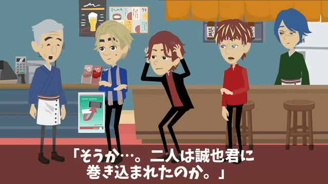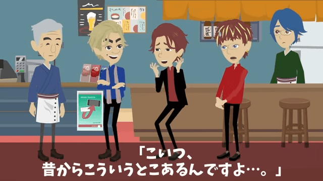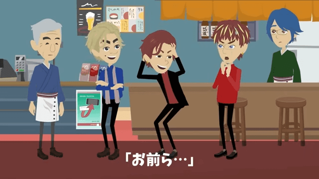 同級生の2人は、もう1人の同級生に巻き込まれただけだと店主に説明します。 一方、自分だけ責任を押しつけられた同級生は「お前ら…」と怒り…。