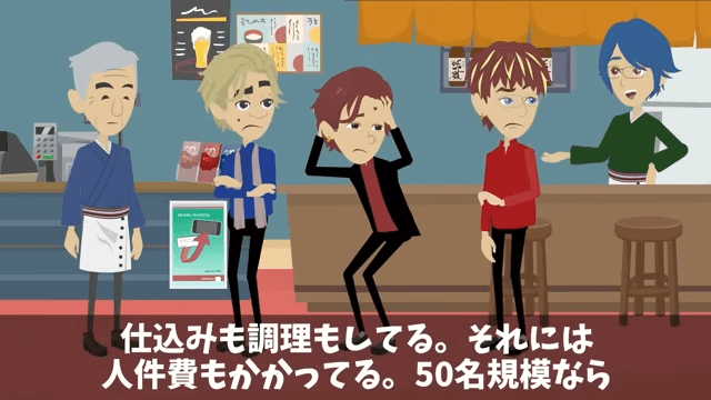 店主は「キャンセル料は100%払ってもらうこととしましょう」と同級生たちに言いました。 それを聞いた同級生たちは「そんなバカな。せめて50%…いや30%でしょ!」と反論しますが、主人公がなぜキャンセル料がかかるのかを説明し始めて…。