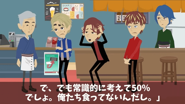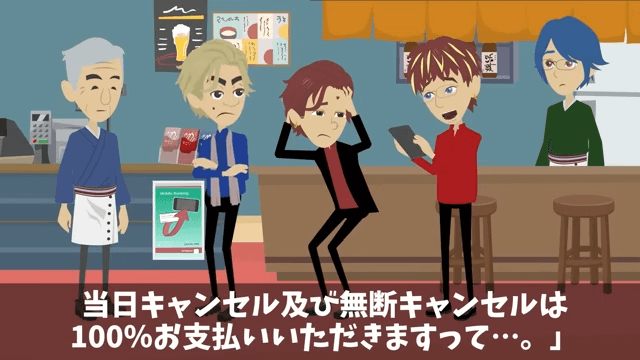 店主は当日キャンセルはキャンセル料が100%だとメールにも書かれていると説明します。 しかしそれでも納得できない同級生は「で、でも常識的に考えて50%でしょ。俺たち食ってないんだし」と言い張り…。