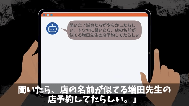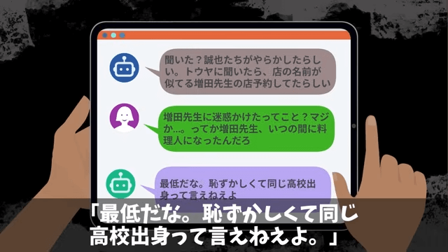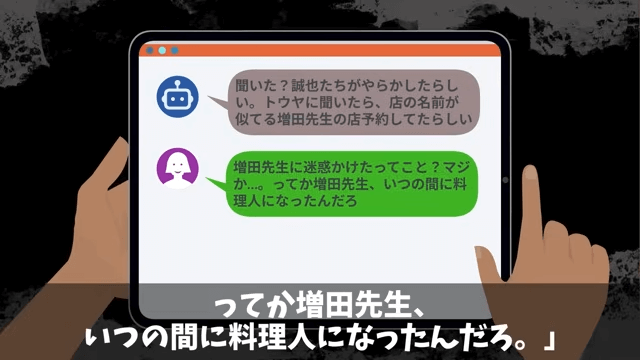 同級生たちは、自分たちがほかの同級生たちからブロックされていることを知ります。 一方、ほかの同級生たちは、同級生たちが店主に迷惑をかけたことについてチャットで話していました。