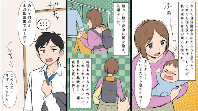 亭主関白な夫と離婚し、これからは自分の人生を歩もうと晴れやかな気持ちになっていた主人公。 しかし息子家族が家に転がり込んできて、主人公に家事や子育てを丸投げするようになります。