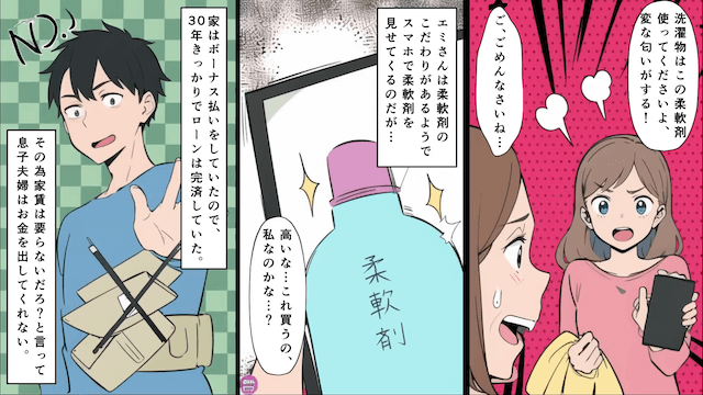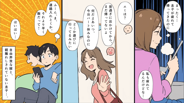 親離れできていない息子と自由奔放な嫁に、主人公は疲弊して…。