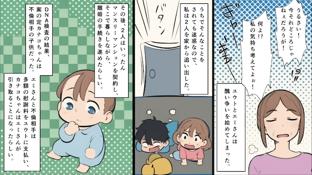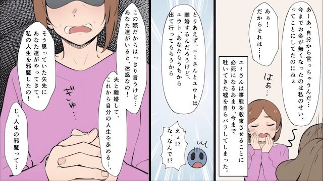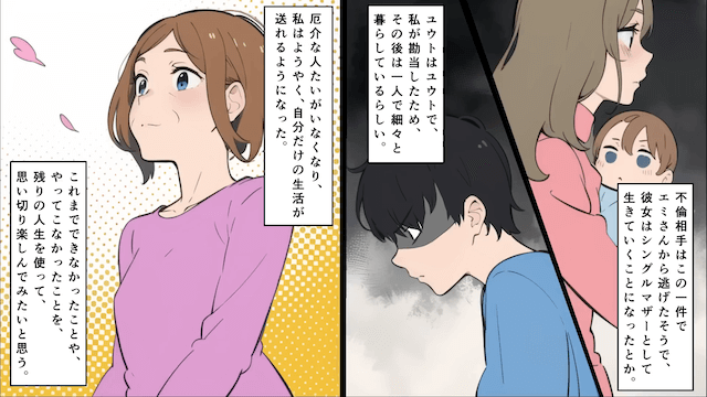 嫁が主人公を悪者に仕立て上げようとしたため、嫁の浮気の証拠を息子に見せた主人公。 その結果、息子夫婦は離婚し、主人公は自分だけの生活を送れるようになったのでした。