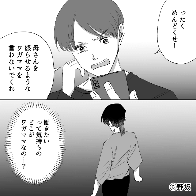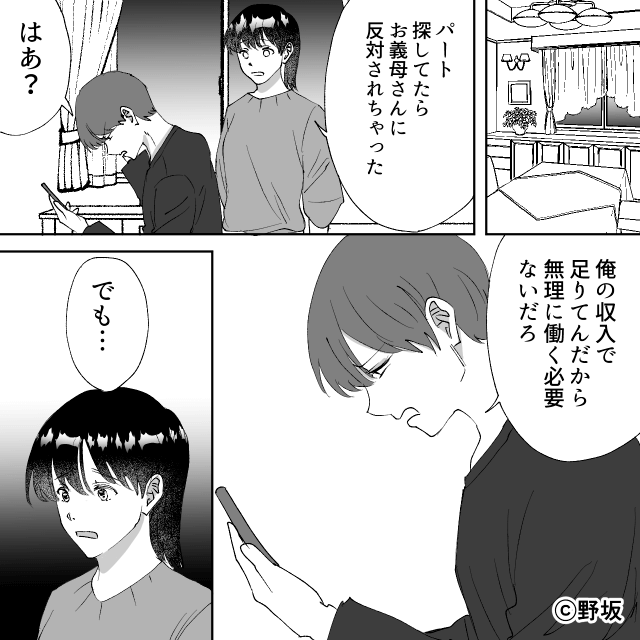 夫と義母に責められる毎日にうんざりし、自立のためにパートを検討し始めた主人公。 しかし夫にも義母にも働くことはわがままだと言われ、反対されてしまうのでした。