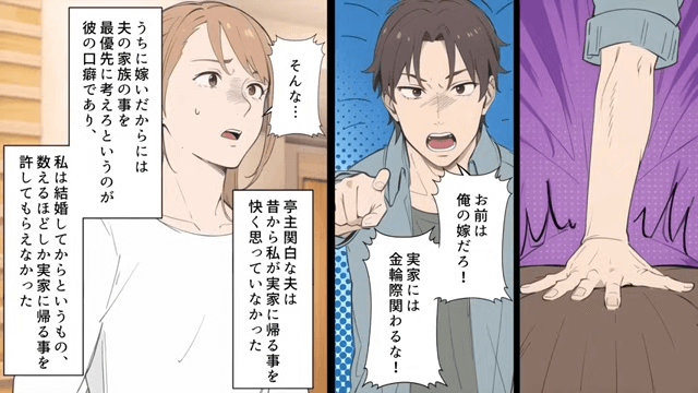 父から母が倒れたと聞かされた主人公は、実家に帰って両親に息子を会わせたいと思います。 しかし亭主関白な夫は、主人公が実家に帰ることを許してくれませんでした。