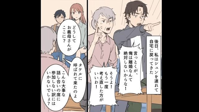 後日、主人公は離婚協議のため、息子を連れて家に帰りました。 するとそこには夫だけでなく、義両親も同席していて…。