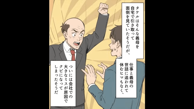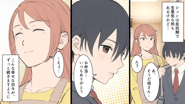 義父と離婚した義母を引き取ることになった夫は、寝る間も惜しんで働き詰めの生活を送っています。 一方、息子との生活にも慣れてきた主人公は「こんな幸せな日々が、ずっと続きますように」と願うのでした。