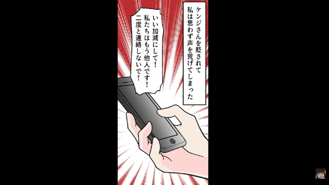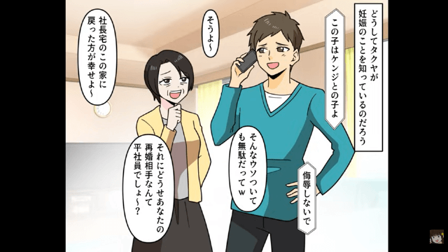 元夫は主人公と夫の間にできた子どもを自分の子どもだと勘違いしており、復縁を迫ってきたようでした。 そして元義母が「どうせあなたの再婚相手なんて平社員でしょ~?」「社長宅のこの家に戻った方が幸せよ~」と言ってきたため、主人公は激怒して電話を切ったのです。