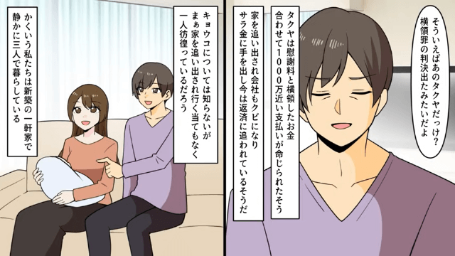 元夫は会社をクビになった上に家から追い出され、慰謝料と横領したお金の返済で1000万円近い支払いを命じられたようです。 一方、主人公と夫は迷惑な元夫と元義母のことを忘れ、生まれてきた子どもとともに新築の一軒家で幸せな暮らしを送るのでした。