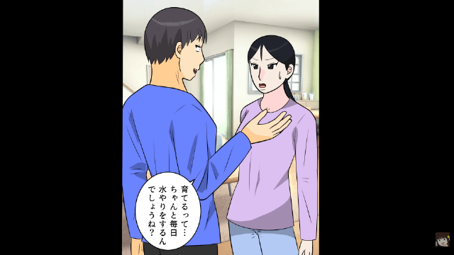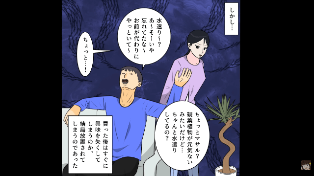 ネットで見かけたという珍しい観葉植物を買った夫は、自分で育てることを主人公に約束しました。 しかし夫はいつも買ったものへの興味をすぐに失ってしまうため、結局観葉植物もろくに世話をせず放置していたのです。