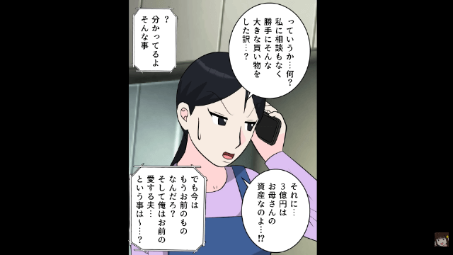 主人公は夫が勝手に書類を見た上に、3億円を生前贈与されたと勘違いしていることを知って驚きました。 しかし夫は真実に気づくことなく、主人公に「お前のものは俺のもの、俺のものも俺のもの」と勝手なことを言ってきたのです。
