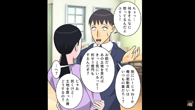 夫の言動に我慢の限界だった主人公は、帰ってきた夫に「もうあなたとはやってられないわ」と離婚宣言をしました。 そして主人公は事の重大さを理解していない夫に、3億円の土地を買ってどうするつもりだったのかを尋ねたのです。