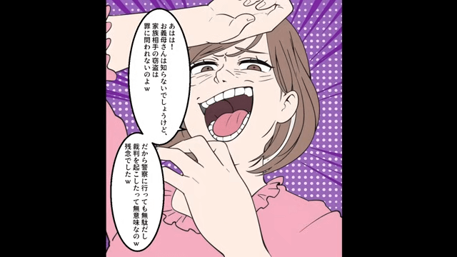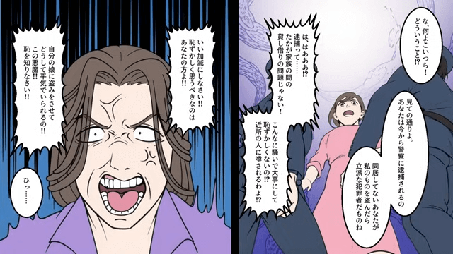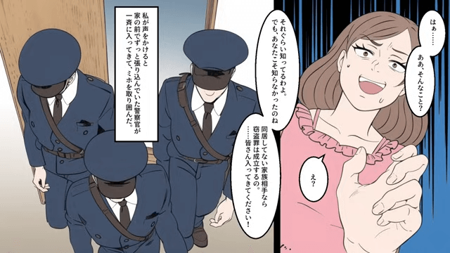 義娘が家族相手の窃盗は罪に問われないと言うと、主人公は同居していない家族相手なら窃盗罪が成立することを説明しました。 そして義娘は主人公が呼んでいた警察官たちに取り囲まれます。