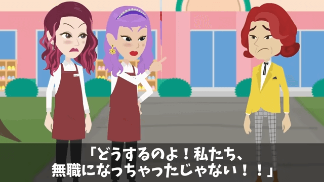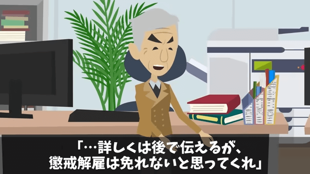 慶弔休暇の件も知っていたオーナーは「…詳しくは後で伝えるが、懲戒解雇は免れないと思ってくれ」と園長たちに伝えます。 その後、先生は「どうするのよ!私たち、無職になっちゃったじゃない!」と園長を責めました。