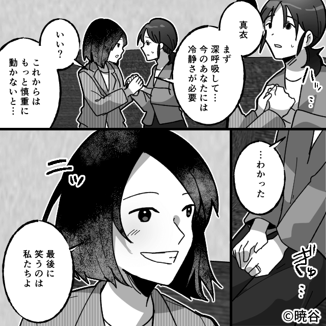 弁護士の友人に事情を説明した主人公は「2人に地獄を見せてやりたいの…!」と反撃を決意し…。 友人と一緒に、慎重に動くことにしたのでした。