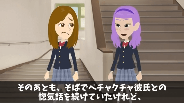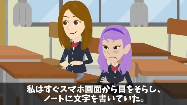 同級生の彼氏の写真を見た主人公が「カッコいいと思うよ…男らしくて…」と言うと、同級生は嬉しそうにはしゃぎます。 そして同級生はそのまま話し続けましたが、主人公はそれを無視してノートに文字を書き始めました。