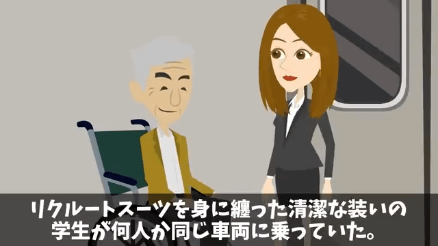 今回は『面接前に電車で身体の不自由な車椅子の男性を助けた結果』を紹介します。 主人公は電車内に自分と同じようにリクルートスーツを着ている学生が何人か乗っていることに気づきます。 そして主人公が男性との会話を楽しんでいると、舌打ちの音が聞こえてきて…。