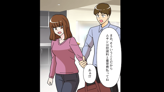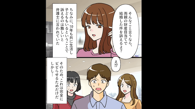 そんな夫に呆れた主人公が「両親の財産目当てで結婚した件を訴えるよ?」と告げると、夫は「冗談だよ!」とおとなしくなったのでした。