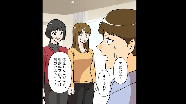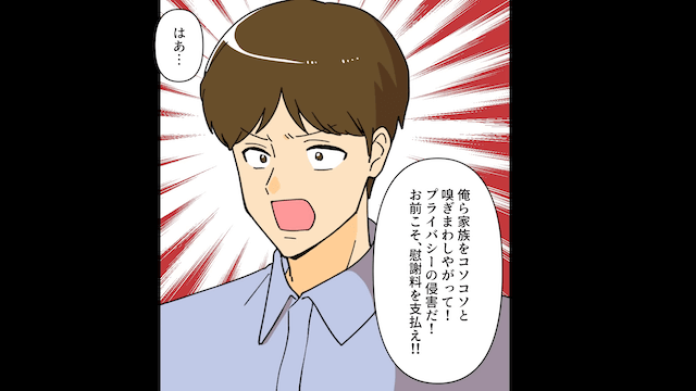 夫に「慰謝料を支払うのはあんたでしょ」と言い、夫の浮気の証拠を突きつけた主人公。 さらに主人公が義母と義妹のことも調べたと言うと、夫は「プライバシーの侵害だ!」と怒って再び慰謝料を請求してきました。