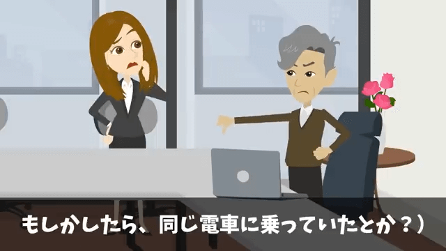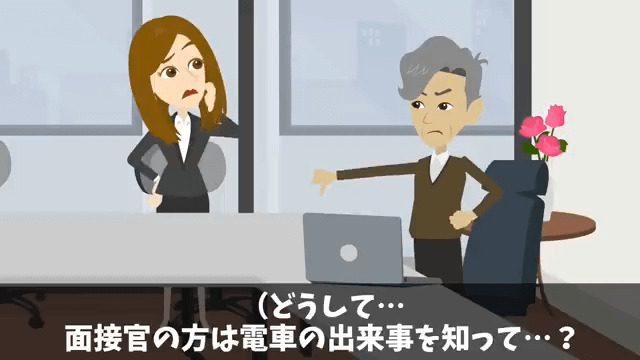 面接が終わり、同級生たちはフラフラと立ち去っていきました。 そして主人公は、どうして面接官が電車での出来事を知っているのか不思議に思います。