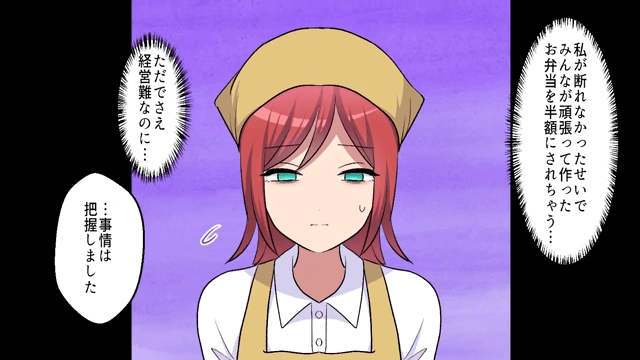 同級生からの電話に主人公が困っていると、店長代理が電話を代わりました。 そして店長代理が「では、注文は全部キャンセルで承ります!」と言ったため、主人公は驚きます。