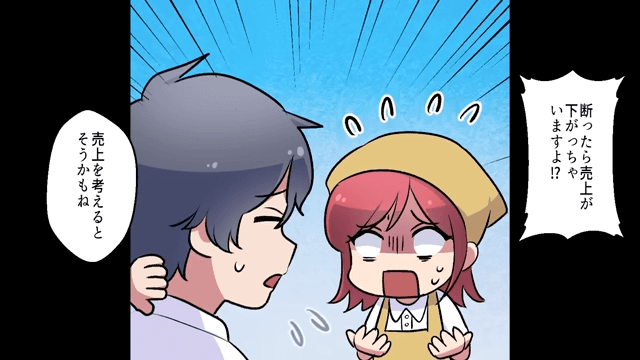 主人公は、定期配達を断れば売上が下がってしまうと店長代理に伝えます。 すると店長代理は「売上を考えるとそうかもね」と言いつつ「でも、我慢してもいいことはないよ」と話しました。