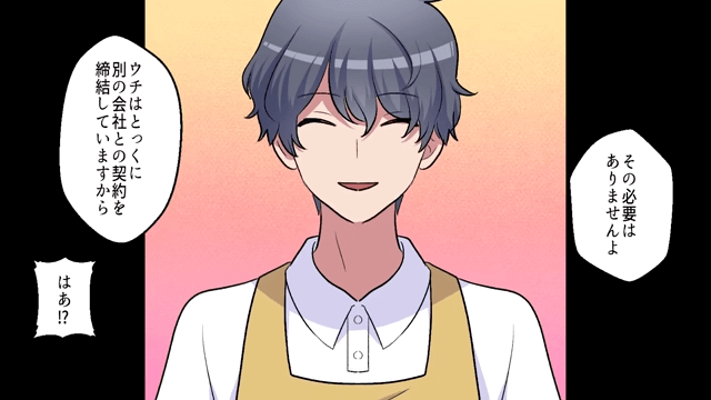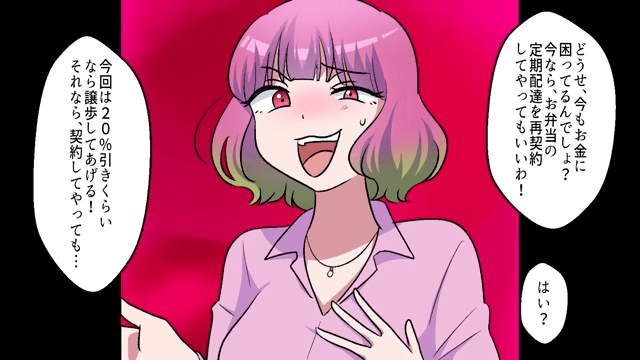 同級生は主人公に、20%引きなら弁当の定期配達を再契約してもいいと言います。 それに対し店長代理は「その必要はありませんよ」と同級生の提案を断りました。