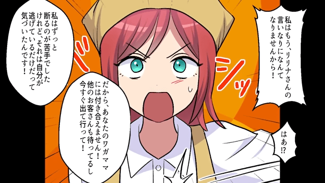 主人公は「あなたのワガママには付き合えません!」と言って、同級生を追い返そうとします。 そして店で待っている客たちも「こっちはどれだけ待ってると思ってんのよ!」と同級生に文句を言いました。
